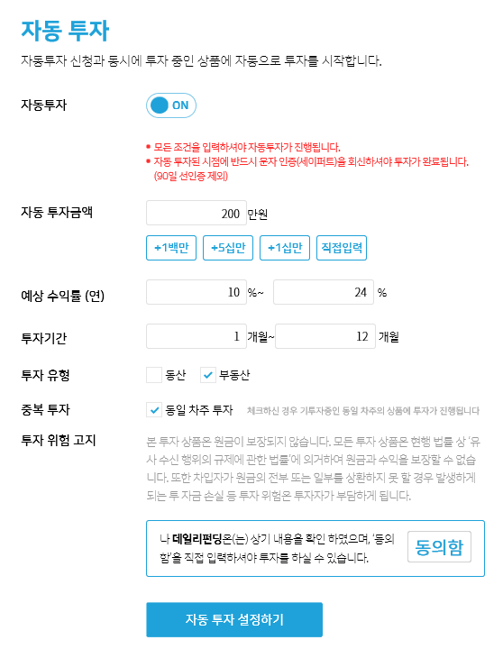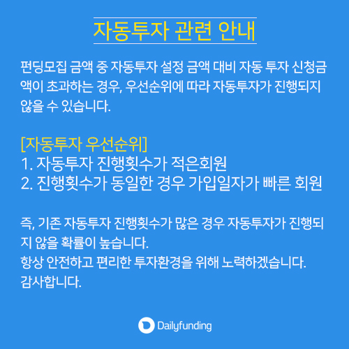 자동투자 조건이 변경되어 기존에 자동투자를 설정하셨던 회원분들께서는 다시 한번 자동투자 설정을 부탁드리겠습니다.