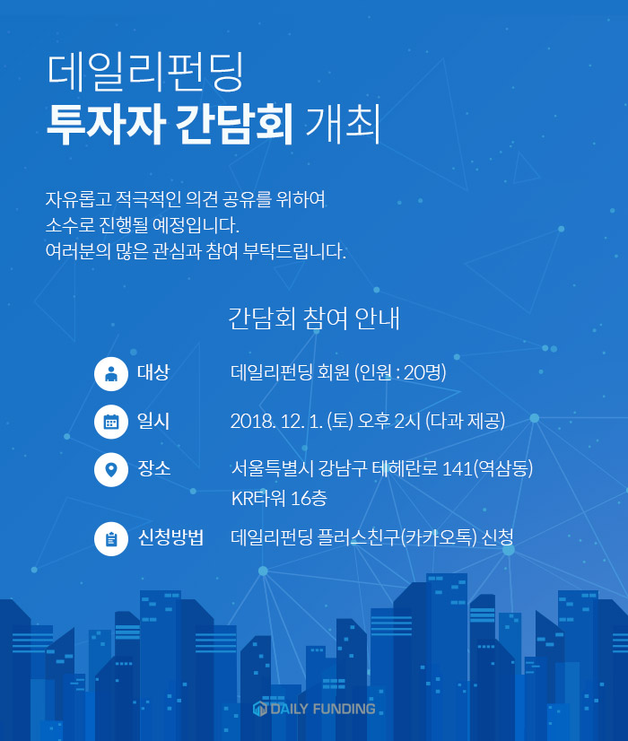 [데일리펀딩] 투자간담회 안내 공지 [데일리펀딩] 투자간담회 안내 2018.11.23 작성자 "매일이 행복한 데일리펀딩" ※우선순위는 투자자, 선착순입니다.이전 간담회 참석자는 신청자가 많을 경우 참석이 제한 될 수 있습니다. 명단확정되면 공지 및 문자알림 드리겠습니다.※주차지원이 되지 않습니다. 대중교통을 이용하여 주시길 바랍니다.감사합니다. 목록