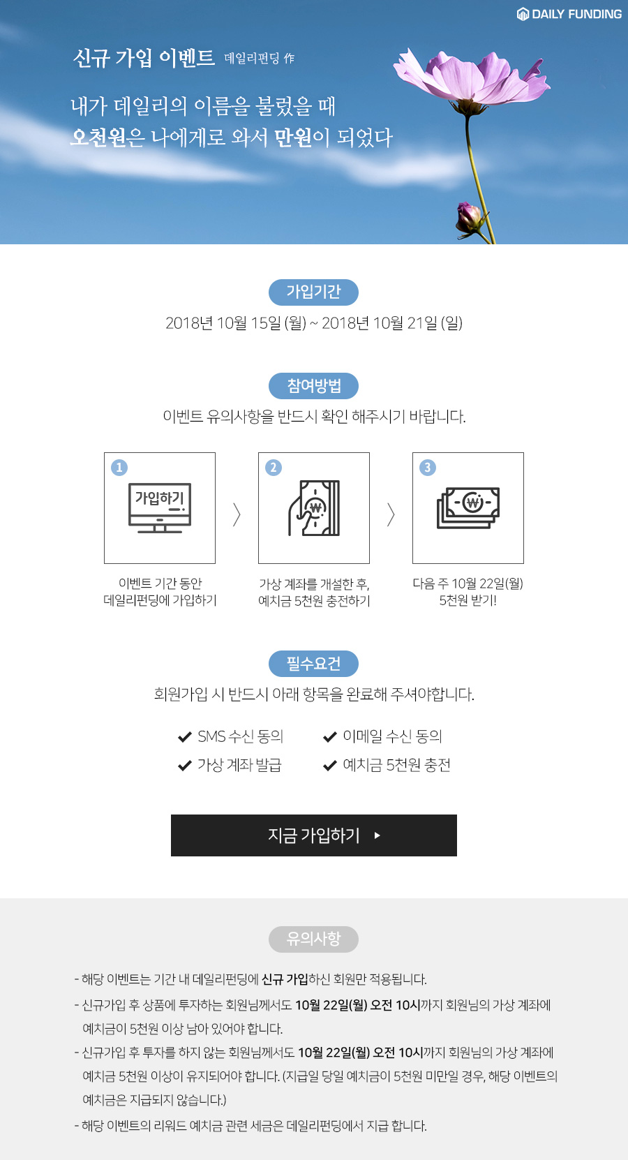 신규가입 이벤트(10월15일~10월21일) 공지 신규가입 이벤트(10월15일~10월21일) 2018.10.15 작성자 "매일이 행복한 데일리펀딩" 안녕하세요. 데일리펀딩입니다. 데일리펀딩이 10월 15일~10월 21일 신규가입이벤트를오픈하였습니다.많은 참여 부탁드립니다.감사합니다. 목록