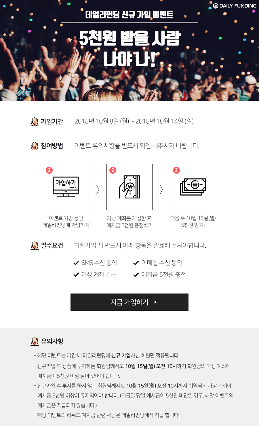 신규가입 이벤트(10월8일~10월14일) 공지 신규가입 이벤트(10월8일~10월14일) 2018.10.08 작성자 "매일이 행복한 데일리펀딩" 안녕하세요. 데일리펀딩입니다. 데일리펀딩이 10월 8일~10월 14일 신규가입이벤트를오픈하였습니다.많은 참여 부탁드립니다.감사합니다. 목록