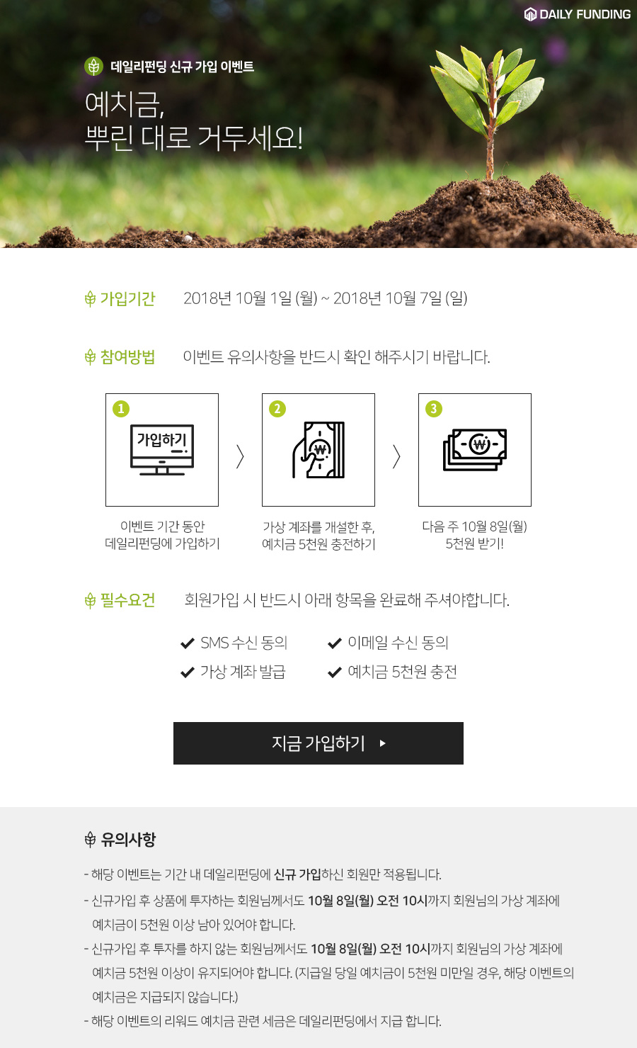 신규가입 이벤트(10월1일~10월7일) 공지 신규가입 이벤트(10월1일~10월7일) 2018.10.01 작성자 "매일이 행복한 데일리펀딩" 안녕하세요. 데일리펀딩입니다. 데일리펀딩이 10월 1일~10월 7일 신규가입이벤트를오픈하였습니다.많은 참여 부탁드립니다.감사합니다. 목록