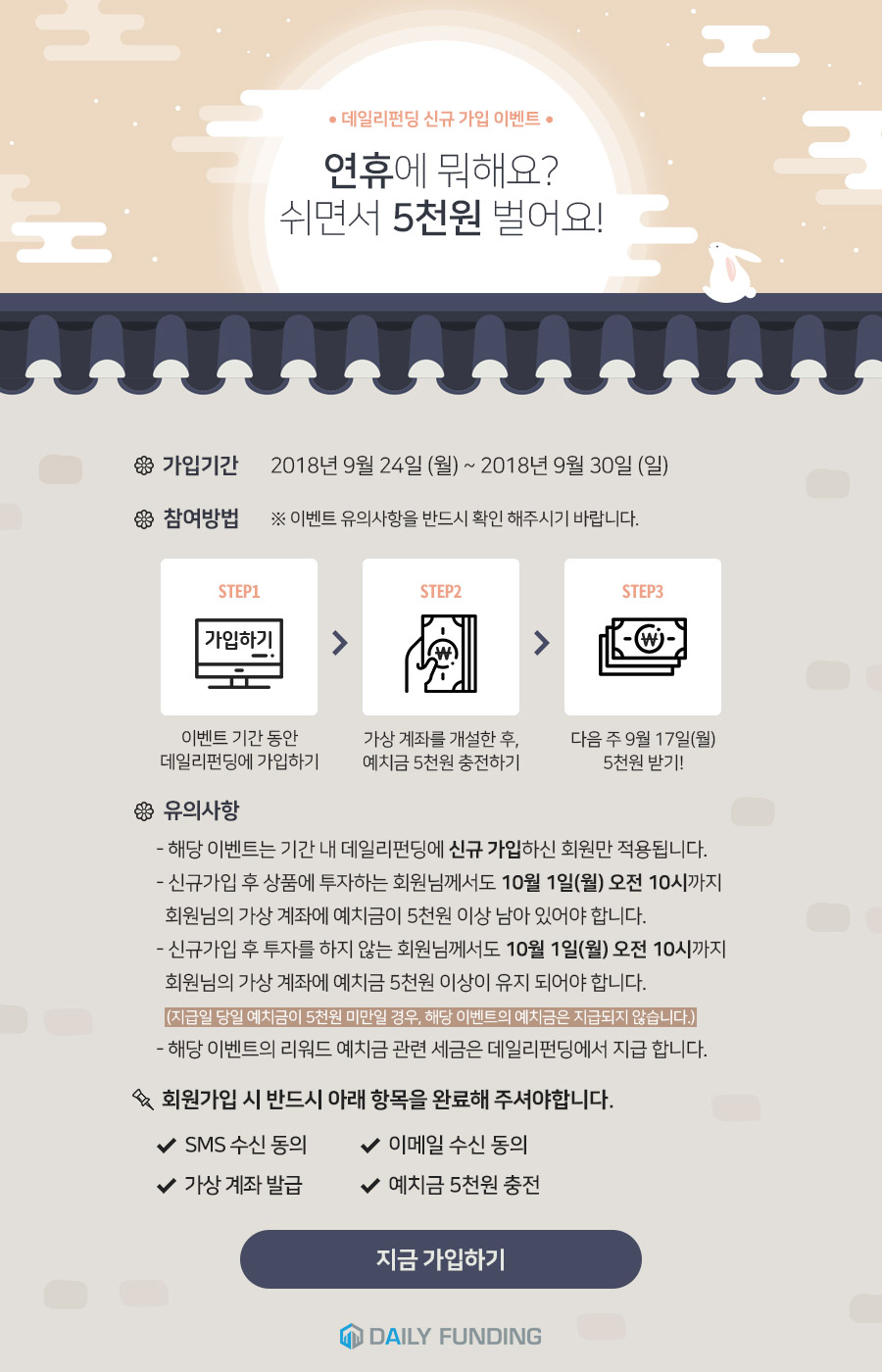 신규가입 이벤트(9월24일~9월30일) 공지 신규가입 이벤트(9월24일~9월30일) 2018.09.27 작성자 "매일이 행복한 데일리펀딩" 안녕하세요. 데일리펀딩입니다. 데일리펀딩이 9월 24일~9월 30일 신규가입이벤트를오픈하였습니다.많은 참여 부탁드립니다.감사합니다. 목록