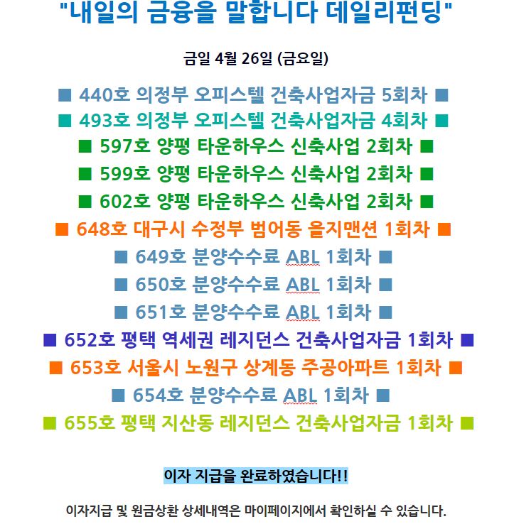 [데일리펀딩] 데일리 440호,493호,597호,599호,602호,648호~655호 상품 이자지급 완료 공지