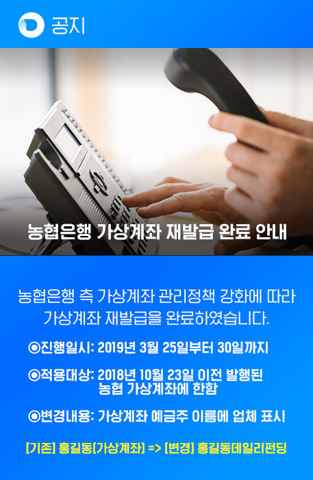 농협은행 가상계좌 재발급 완료 안내 공지 농협은행 가상계좌 재발급 완료 안내 2019.04.04 작성자 da… "데일리펀딩 내일의 금융을 말합니다." 안전한 투자환경을 위해 최선을 다하겠습니다.감사합니다. 목록