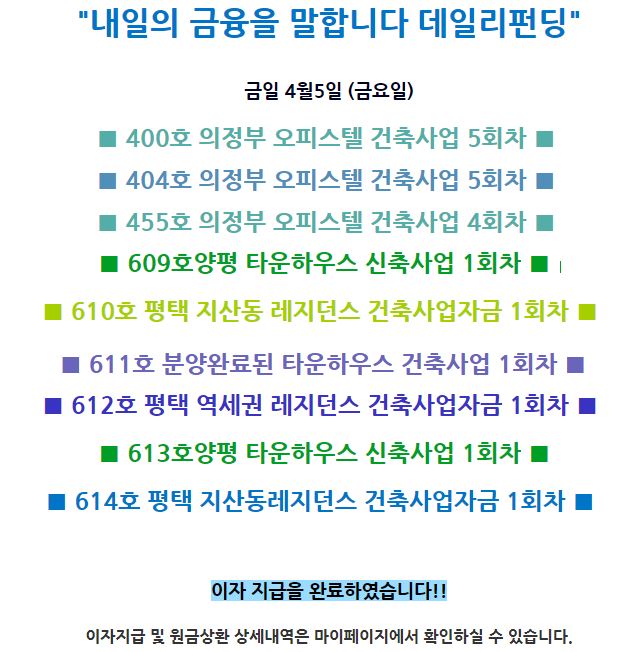 [데일리펀딩] 데일리 400호,404호,455호,609호~614호 상품 이자지급 완료 공지 공지 [데일리펀딩] 데일리 400호,404호,455호,609호~614호 상품 이자지급 완료 공지 2019.04.05 작성자 목록