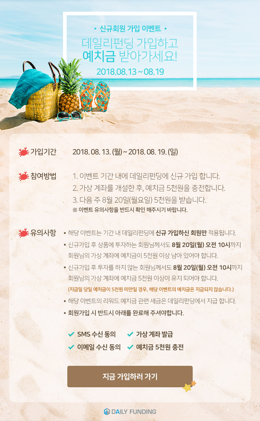신규가입이벤트(8월13일~8월19일) 공지 신규가입이벤트(8월13일~8월19일) 2018.08.13 작성자 (주… "매일이 행복한 데일리펀딩" 안녕하세요. 데일리펀딩입니다. 데일리펀딩이 8월 13일~8월 19일 신규가입이벤트를오픈하였습니다.많은 참여 부탁드립니다.감사합니다. 목록