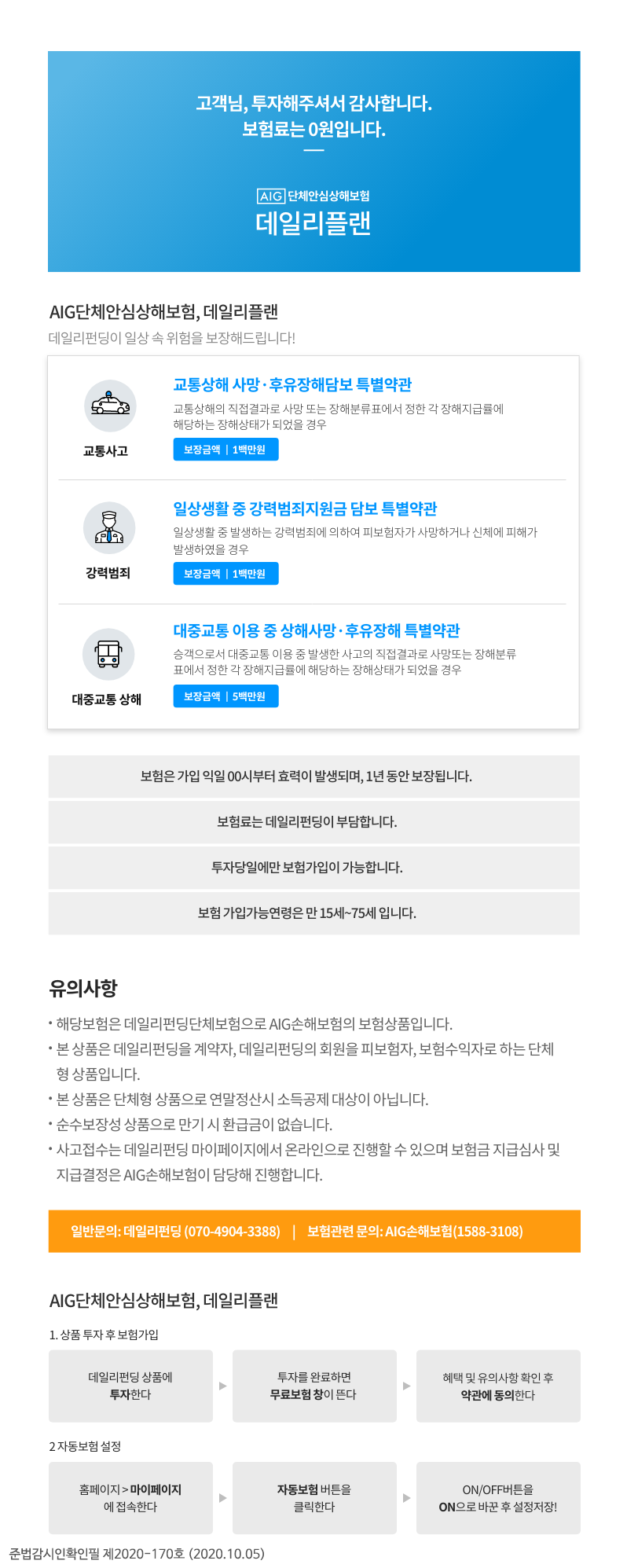데일리펀딩, AIG 단체안심상해보험 데일리플랜 무료보험서비스 제공