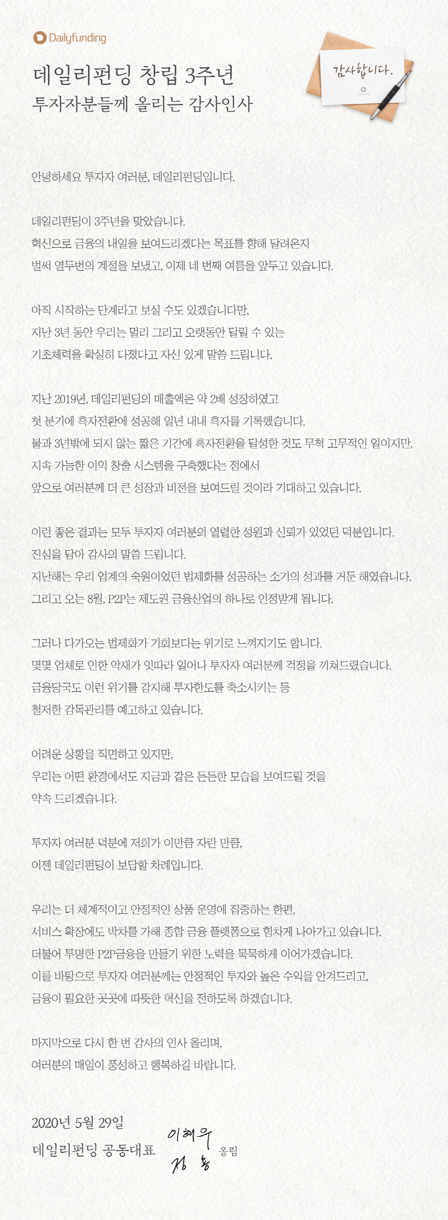 데일리펀딩 창립3주년 투자자분들께 올리는 감사인사