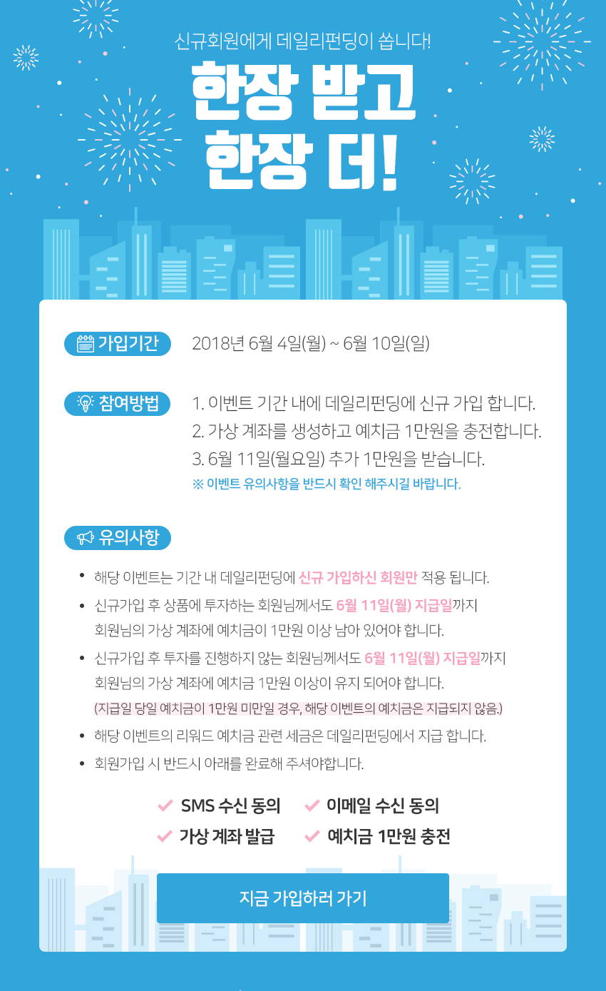 신규가입이벤트(6월4일~6월10일) 공지 신규가입이벤트(6월4일~6월10일) 2018.06.04 작성자 (주… 투자 전, 꼭 확인하세요!연체율 0%! 부실률 0%! (2018-06-04, 데일리펀딩 기준) "매일이 행복한 데일리펀딩" 안녕하세요. 데일리펀딩입니다. 6월4일~6월11일 신규가입이벤트를 오픈하였습니다.많은 참여 부탁드립니다.감사합니다. 목록
